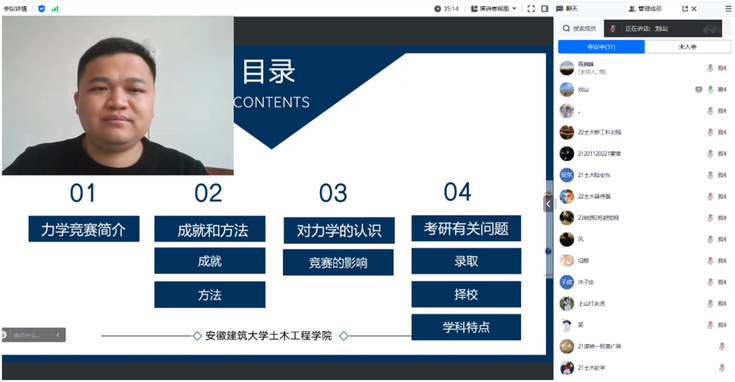本网讯 为了激发学生对力学的兴趣,提高学生们的理论素养和实践能力,3月16日的下午2点,土木工程学院工程力学教研室邀请刘山校友为同学们开展一次“力学竞赛与考研经验交流”线上报告,刘山等已毕业学长给学生们分享交流竞赛经验,并且也为正在考研的同学分享考研经验,报告由高冀峰老师主持,40多位同学参与聆听互动。