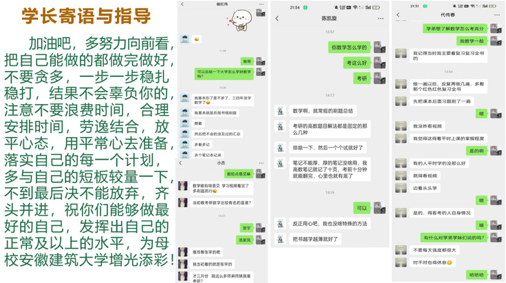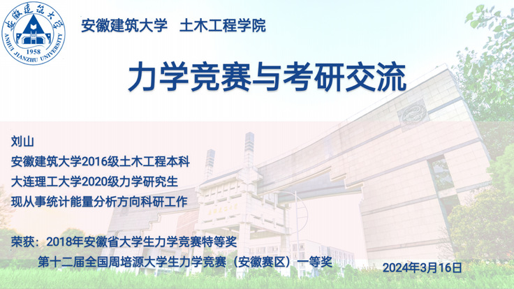 之后刘山学长自身经验出发深刻分析考研复习,方向,择校等问题,为学生们介绍了土木类院校和力学类院校,并且重点介绍了力学的研究内容和就业前景,为同学们提供参考。