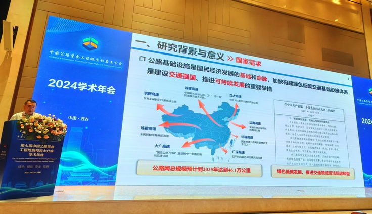 蔡国军教授受邀在本次大会“极端环境工程地质灾害勘察技术与发展动态”分论坛做特邀报告,报告题目为“路基工程废弃物资源化利用关键技术及应用研究”,主要介绍了建筑渣土路堤填料细观表征及内部状态演化分析、再生纤维路基土微观加固机制及宏观力学表征以及路基工程废弃物资源化利用长期服役性能评价,报告得到了与会专家学者的高度好评。