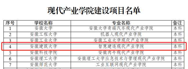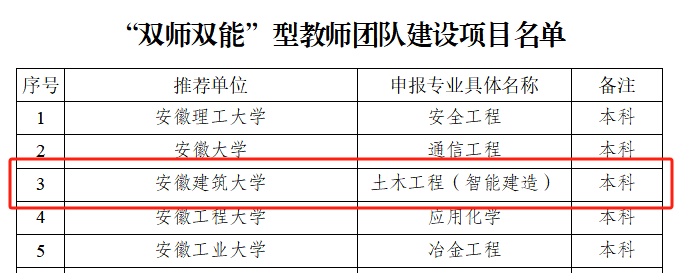 本网讯  近日,安徽省教育厅公布了高校“双特色”建设(培育)项目名单,我院申报的2个项目全部获批。其中,“智慧建造现代产业学院”获批现代产业学院建设项目,“土木工程(智能建造)”专业获批“双师双能”型教师团队建设项目。