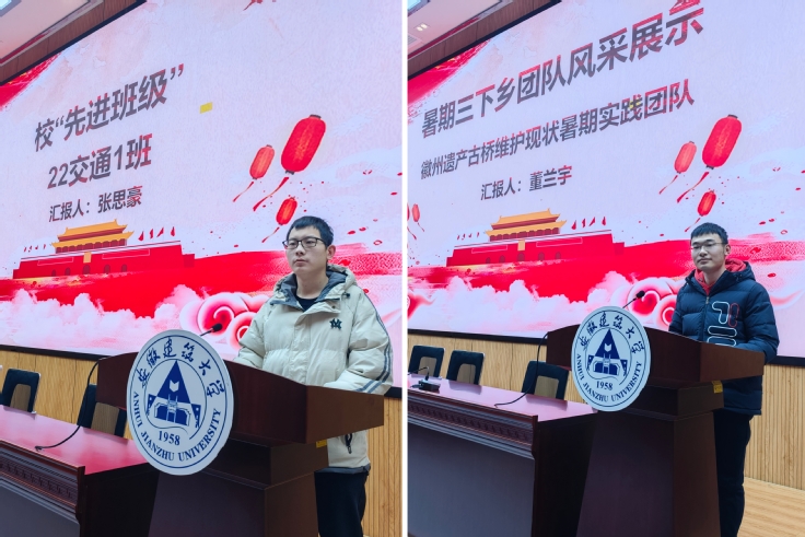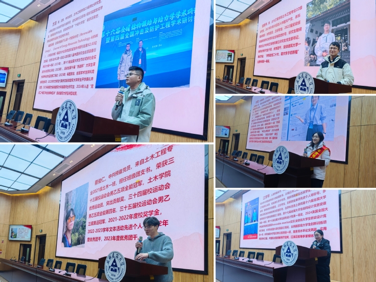 成果展示环节,来自校先进班级22级交通工程1班的张思豪同学从班级概况、学业成绩及思想建设、竞赛成果、文体实践、宿舍建设五个方面介绍了班级建设的经验与成果。22级交通工程的董兰宇同学代表“徽州遗产古桥维护现状调研暑期社会实践”团队,回顾了暑期三下乡期间的感悟,鼓励大家积极担当,主动作为,做徽州古建筑文化的弘扬者、保护者。作为国家奖学金获得者代表,22级土木工程的丰莹同学给大家分享了个人成长路上的心得与感悟。学科竞赛先进代表,22级土木工程的江学琴同学分享在校期间参加各类学科竞赛,特别是全国结构设计大赛的体会与感悟。23级博士方浩同学用真情讲述自己的故事、用感动分享自己的“只管孜孜不倦,其他交给时间”的经历,鼓励同学们树立专业自信,在奋斗中挥洒青春的汗水,在拼搏中铸就人生的篇章。优秀共产党员代表金傲伟从支部基本情况着手,结合“三会一课”及主题党日活动的开展情况,分享了自己特色经验及做法。21级土木工程优秀运动员代表蔡俊仁同学,则分析了学院历届运动会的成绩,号召大家努力拼搏,再创辉煌,为学院运动会奉献一份力量,还特别和与会师生分享了自己生日喜悦。