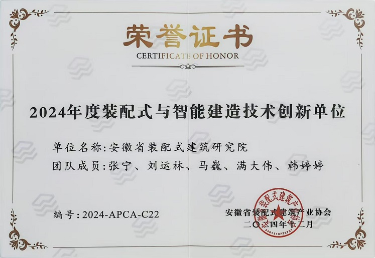 学院科研平台安徽省装配式建筑研究院获评“2024年度装配式与智能建造技术创新单位”;学院教师陈雷雨获评“2024年度建筑技术推广先进个人”。