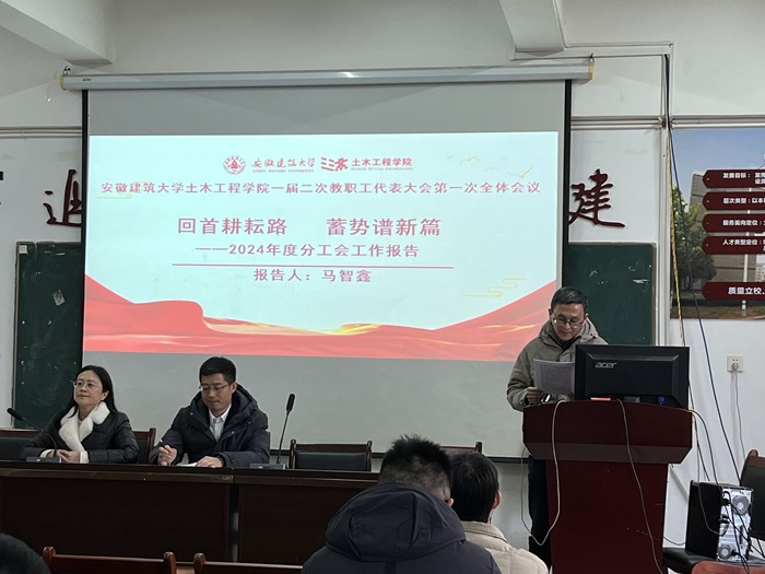 学院党委副书记、分工会主席马智鑫作回首耕耘路 蓄势谱新篇——2024年度学院分工会工作报告。报告总结了过去一年学院以党建带工建强化思想引领开展师德建设筑牢教职工精神根基;推进教职工队伍建设改革,助力职工建功立业;大力支持科研创新,搭建平台收获丰硕科研立项成果;围绕学校中心工作维护教职工权益,构建和谐校园,并开展多样文体活动提升教职工幸福指数等内容。同时对下一步工作进行了详细规划与部署。