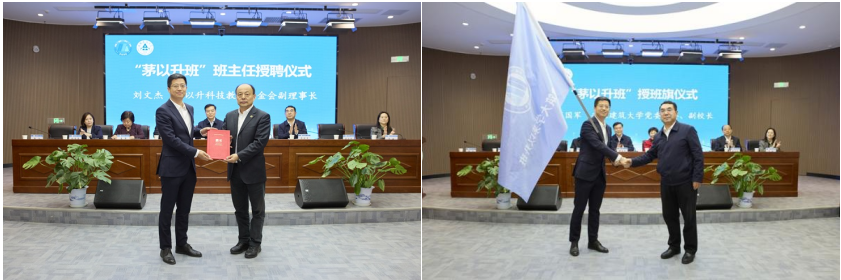 刘文杰向“茅以升班”班主任国家级人才张宁教授颁发聘书,蔡国军授予班旗。