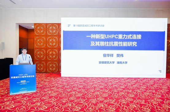 我院博士后宿华祥老师(合作导师:张宁教授、樊伟教授)专注于装配式桥梁的抗震与抗撞性能研究。宿华祥老师在湖南大学读博期间已完成了套筒接头的单轴性能、装配式节点抗剪性能和装配式墩柱抗震性能等方面的研究,在本次会议上基于前期研究成果以《一种新型UHPC重力式连接及其墩柱抗震性能研究》为题做了分会场报告。该新型连接无需压力灌浆,不仅能够有效降低锚固长度,还能提高结合面的抗剪性能和墩柱的抗震性能。