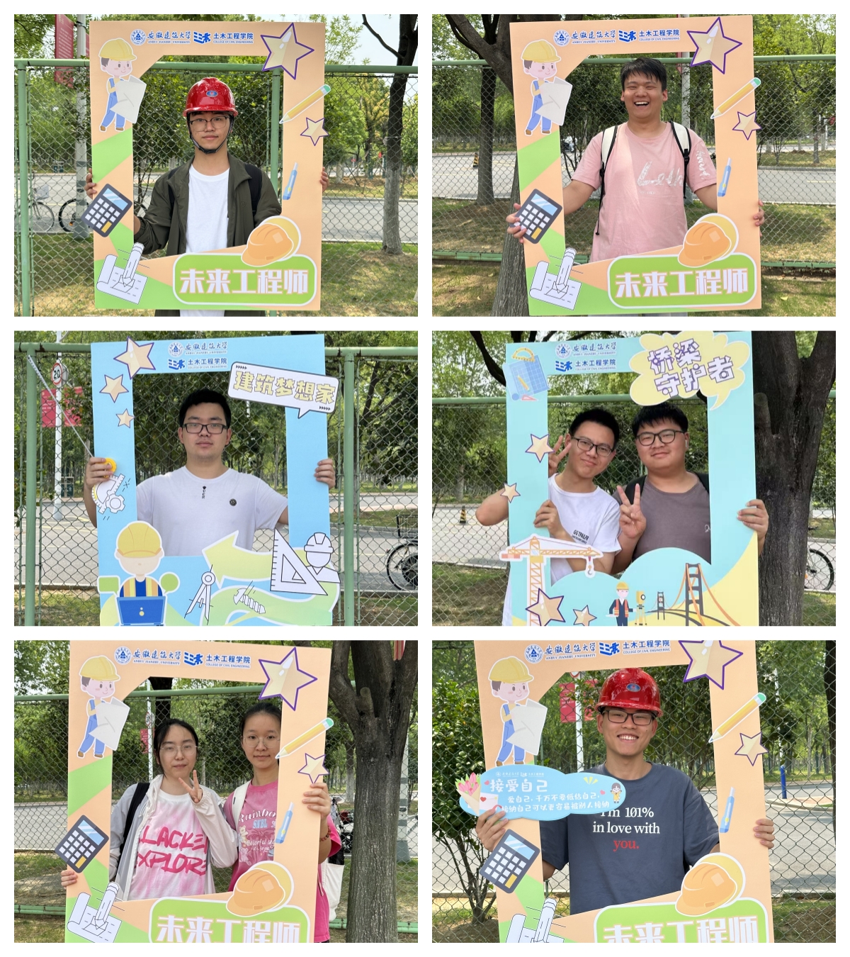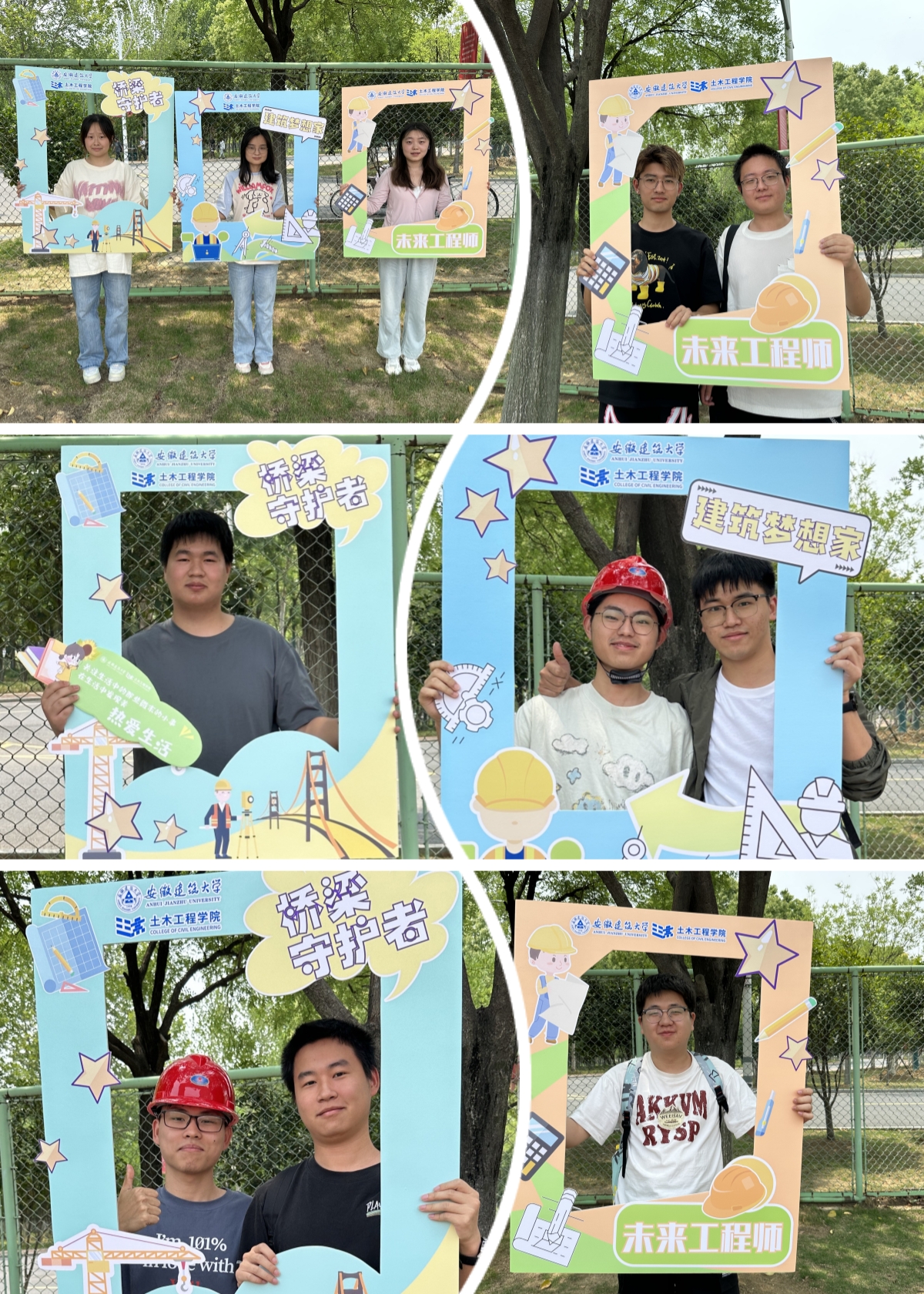 趣味kt板合影打卡区更是成为活动现场的欢乐焦点。造型独特的kt板以土木学院特色为灵感,结合心理健康教育提示语,设计了 “建筑梦想家”、“桥梁守护者”、“未来工程师” 等主题场景。同学们戴上安全帽、手持卷尺,摆出各种有趣的姿势,与kt板合影留念。在 “建筑梦想家”kt板前,几位同学做出手托举建筑的动作,寓意着用双手托起梦想,不惧困难,勇敢做自己;在 “桥梁守护者”kt板处,同学们模拟桥梁设计师认真勘测的模样,展现出对专业的热爱与担当,保持信心,坚定每一个选择。现场快门声不断,一张张照片定格下同学们灿烂的笑容与青春活力。这些承载着心理健康理念的标语,也随着一张张打卡照片,走进学生们的生活,传递着积极向上的能量。