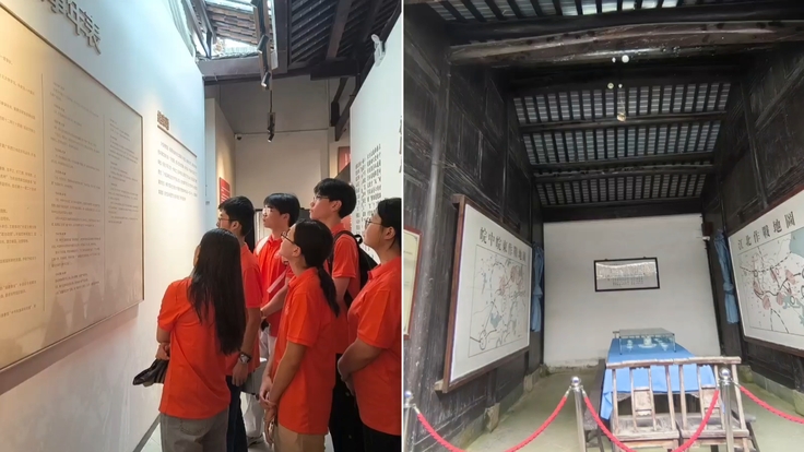 在棋盘村,团队探寻“棋盘布局”中北方营造技艺与徽州特色的融合密码,惋惜叙伦堂拆毁的遗憾,更坚定古建守护决心;黄田古镇“船形村落”的“天人合一”理念里,“四水归堂”天井的排水智慧、马头墙的防火功能,让成员们深刻体会古人与自然共生的建造哲学。从水东老街到黄田古镇,团队用脚步丈量12平方千米的古建群,记录下砖木结构缺陷、消防通道狭窄等30余项调研数据,为古建保护积累第一手资料。 红色铸魂:传承先辈革命精神 “叶挺将军在皖南的108天,写下了多少封作战电报?”在新四军纪念馆,队员们的目光被展区内泛黄的手稿吸引。讲解员介绍,这些字迹里藏着将军在艰苦环境中“运筹帷幄、抗击日寇”的决心,而锈迹斑斑的指挥刀、简朴的粗布军装,更让“坚定信念、不屈斗争”的精神变得生动。在“军民鱼水”展厅,一张 “村民为新四军送粮”的老照片,让队员们热议起“红色基因如何融入当代乡村振兴”。