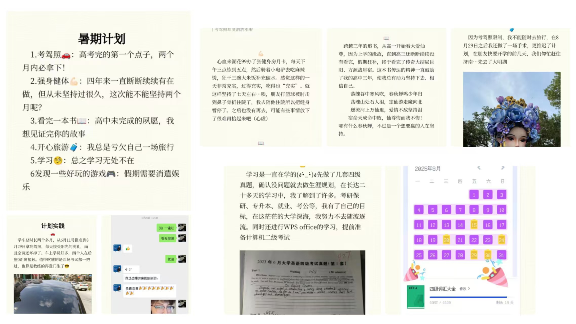 暑假结束后,同学们对自己的暑期计划完成情况进行了全面总结。总结内容丰富详实,涵盖计划完成情况概述、执行过程中的收获与体会、遇到的问题及解决方法以及对未来的展望等多个方面。同学们以文档(日记、报告)、图片(手账)、视频(Vlog)等多种形式提交总结,充分展示了自己的成长与进步。