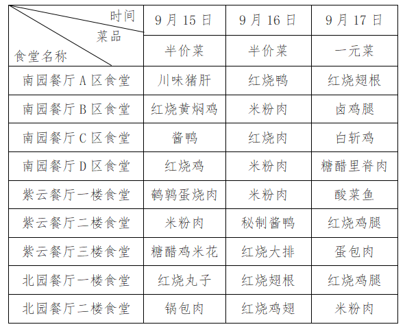 中秋节期间,为营造节日氛围,丰富师生校园生活,学校食堂开展让利优惠活动,各食堂在活动期间每天午餐推出一道全荤菜半价或1元供应,具体安排如下:
